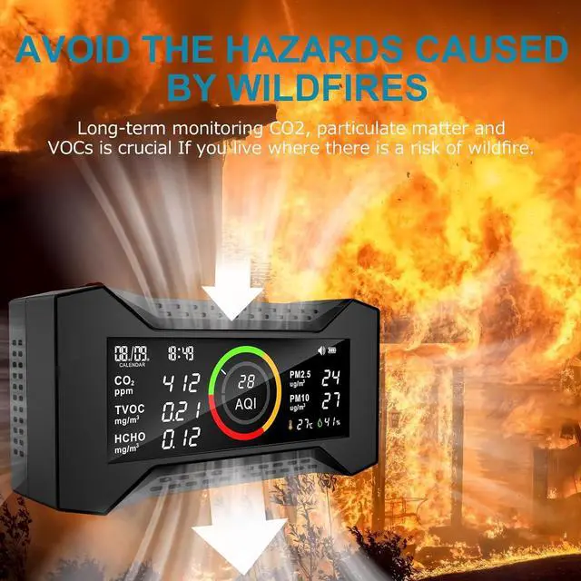 Preventing Damage Caused By Wildfire: Long-term monitoring CO2, particulate matter and VOCs is crucial If you live where there is a risk of wildfire. By measuring particulate pollution, an air quality tester can help you know when to change your homes air filter or open window.