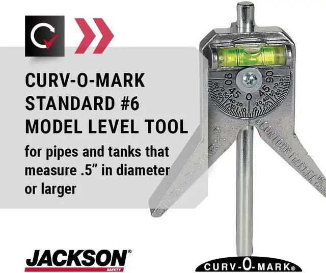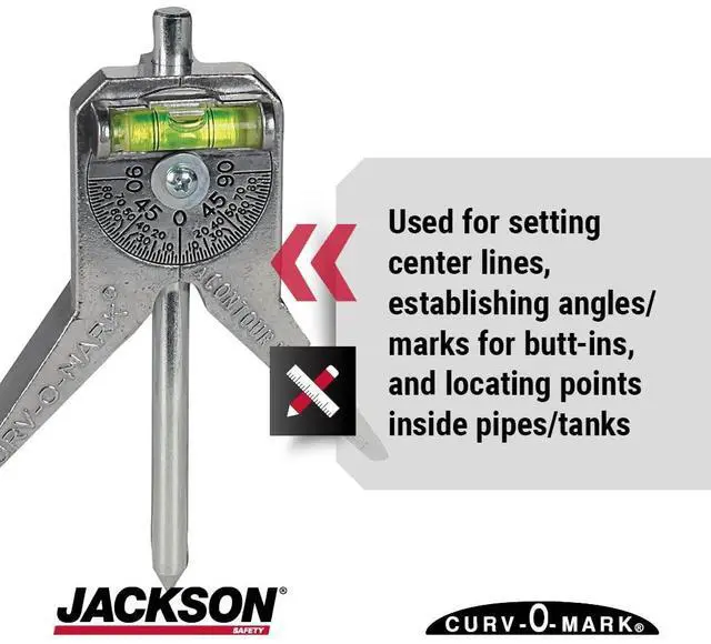 BEST OPERATION Use this manual Jackson Safety hardened centering pin angle finder with a small hammer or mallet to tap the pin in for the most effective pipe markingfalseBUILT-IN PROTRACTOR - Fitted with an adjustable dial bubble protractor (DSL) that reads in 2.5 degree incrementsfalseThis pipe centering tool has numerous functions that help with setting center lines, establishing angles and marks for butt-ins, locating points inside pipes and tanks, laying out keyways and measuring declivity. Key The Standard #6 Model may be used on pipes 1/2" in diameter and larger; The Curv-O-Mark center finder has a 4" Y-Type head fitted with an adjustable dial bubble protractor (DSL), to be used for pipes and tanks.