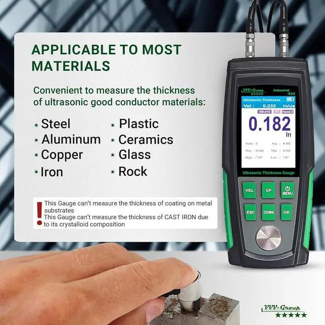 - ACCURACY & RELIABILITY - Highly accuracy with resolution up to 0.01 mm; 2 types of measurement unit (mm or inch); 2 easy and fast calibration types; soundspeed: 1000~9999m/s; statistics review with minimum, maximum and standard deviation.