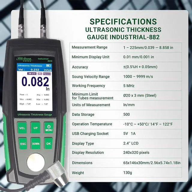 CONVENIENCE AND USABILITY - It is a highly accurate and compact instrument that can be widely used everywhere, in ect in manufacturing, metal processing, commodity inspection and all other testing areas. Can do quick and effective measure surfaces of any shape - concave, rough and convex, thanks to the ultrasonic measuring sensor. falseWIDELY USES - This device can be used for determining the average thickness of pipelines and pressure vessels of production equipment, and also to find the corrosion degree of various parts in use. false- FAST, HAND-HELD AND COMFORT - The device is equipped with a fast microprocessor; has a small and comfortable size and work with an ultrasonic technology.