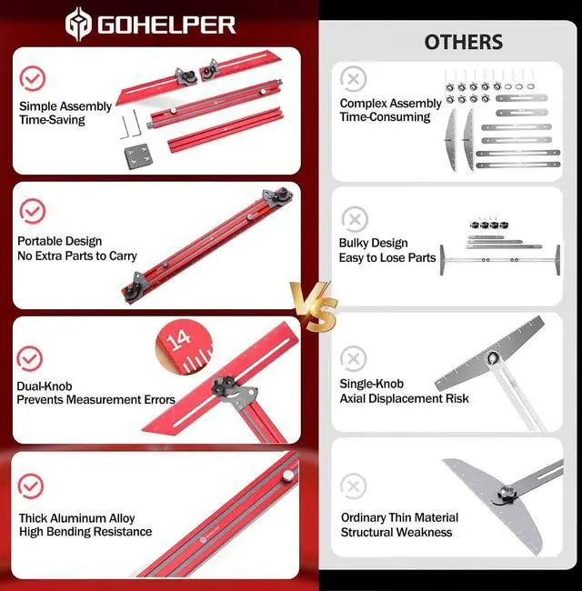 Quality: Crafted from 6061 aluminum alloy with a CNC-anodized anti-corrosion coating, this professional stair tread jig withstands heavy-duty impacts while maintaining structural rigidity. Its scratch-resistant surface integrates laser-etched precision markings for error-free measurements, and is engineered to streamline the installation of stair treads, risers, window sills, and shelving systemsWide