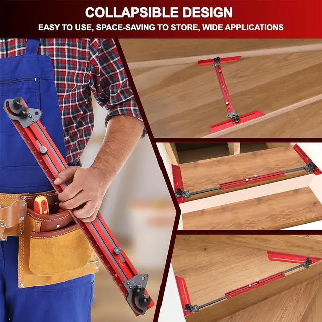 - Enhancing Woodworking Efficiency: The 14 pivoting ends with slots cover the depth of most stair treads, while the 127° adjustable-angle curved slots allow quick adjustment and locking of the stair tread angle. Dual pin stops ensure edge alignment. Simply pull the ends to measure depth seamlessly, enabling precise transfer of both tread angle and width to the boardeffectively enhancing your woodworking efficiency.