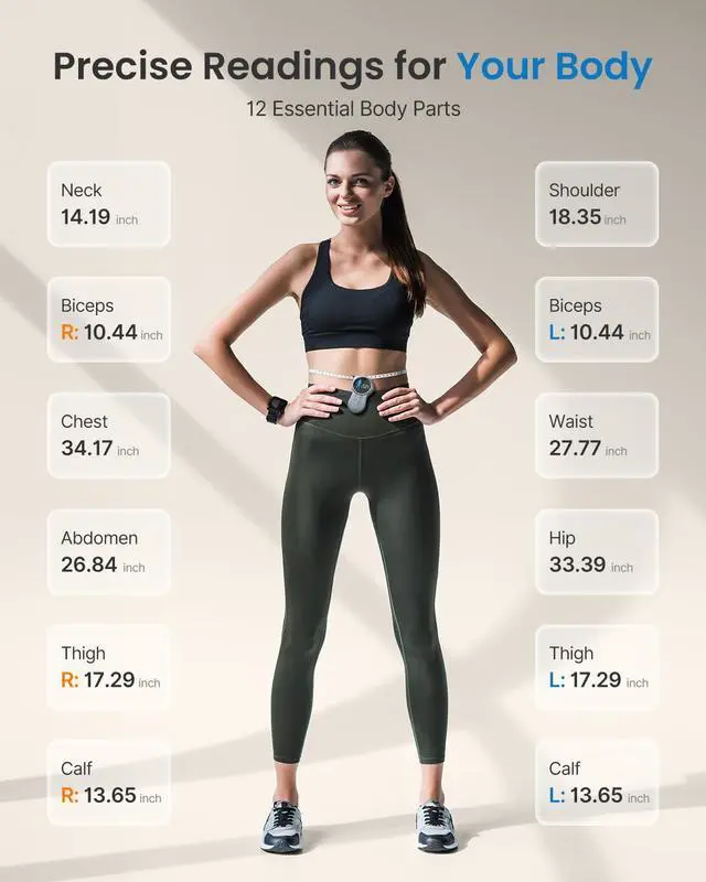 - 2 Measurement Modes: Use General Mode to effortlessly measure and track 12 key body parts (neck, waist, calves, etc), ensuring comprehensive coverage for your fitness and tailoring needs. Use Favorite Mode to instantly access frequently measured body parts for focused efficiency and time savin
