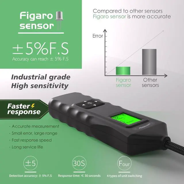 High-precision sensor: Our gas leak detector features an original imported sensor, providing accurate measurement, small error, and a large range. It ensures fast response speed and a long service life.