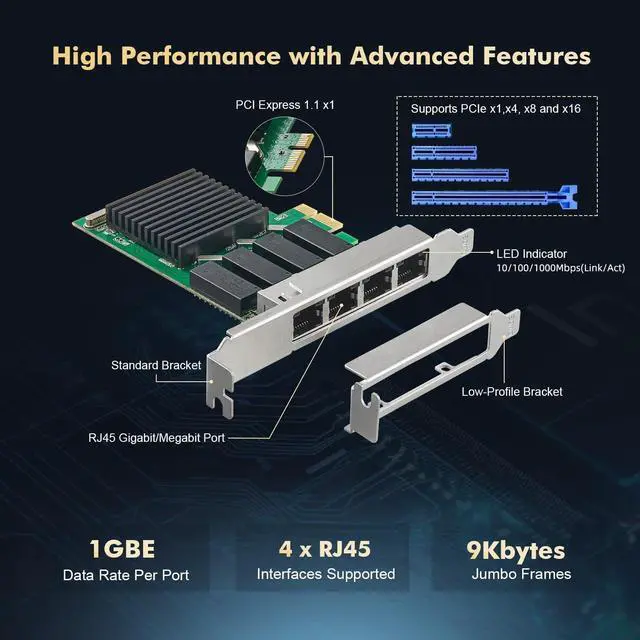 Network FeatureSupport PXE, Auto MDIX, IEEE 802.1Q VLAN, IEEE 802.3 bz( 2.5GBASE -T), Full Duplex flow control(IEEE 802.3 x), IEEE 802.1P Priority, Jumbo frame 16KbytesfalseEasy to UseSelect the appropriate brackets according to the chassis size, insert into the PCIe slots, install the driver, connect to the network, the LEDs show the link status and rate. Any questions, please contact our support email, we will provide timely service. false- Quads Port 2.5G bps The network card has 4 port 2.5 Gigabit with Realtek RTL8125B chip, compatibe 1Gbps/100M/10M auto-negotiation, support standard Cat5e or above UTP at distances up to 100m (328 feet)