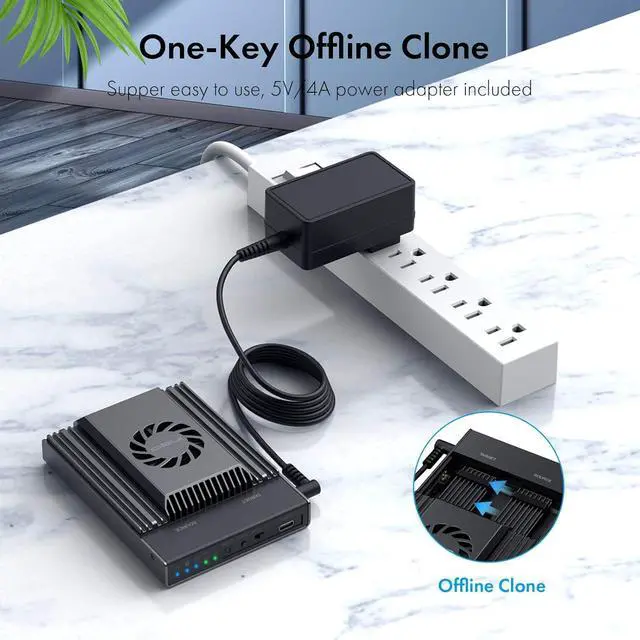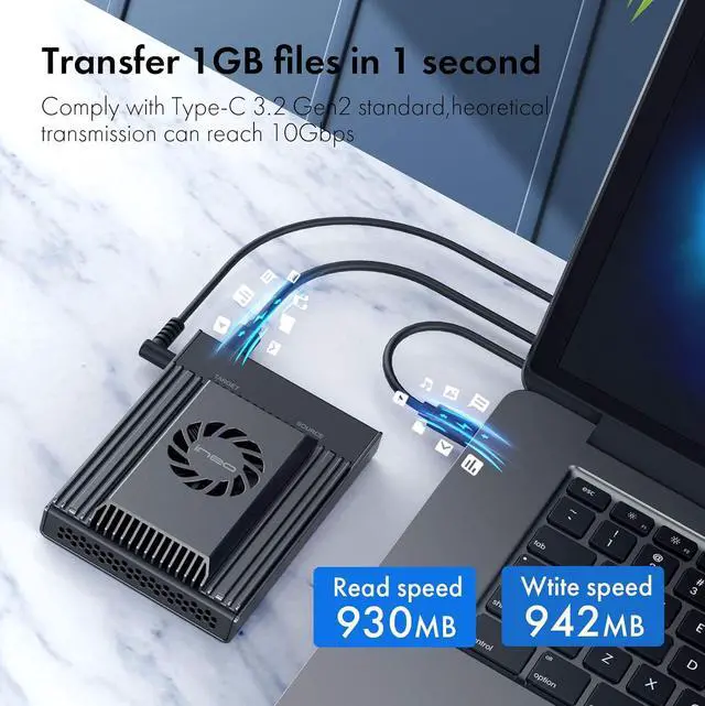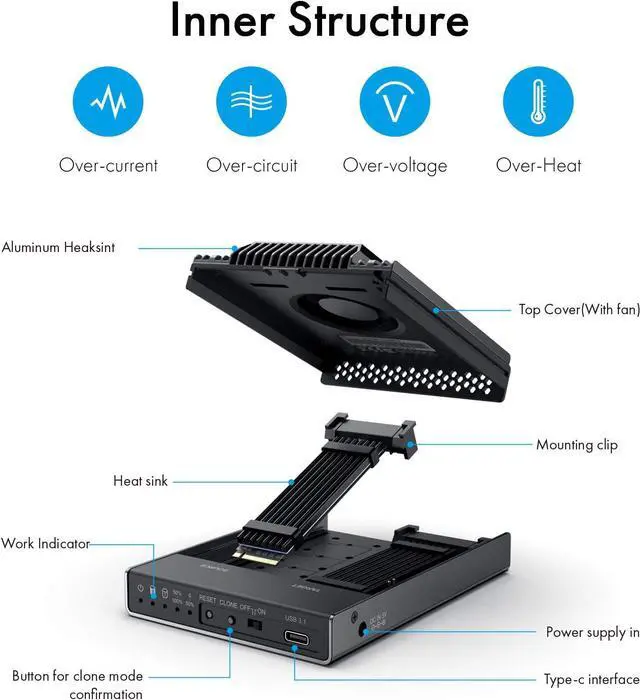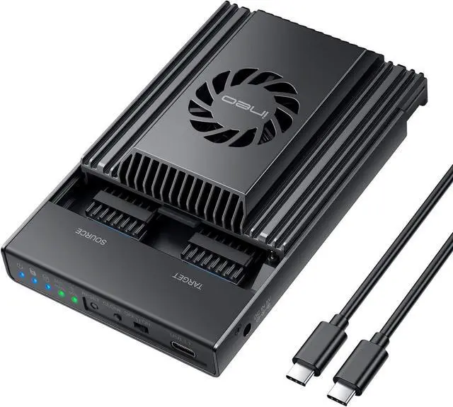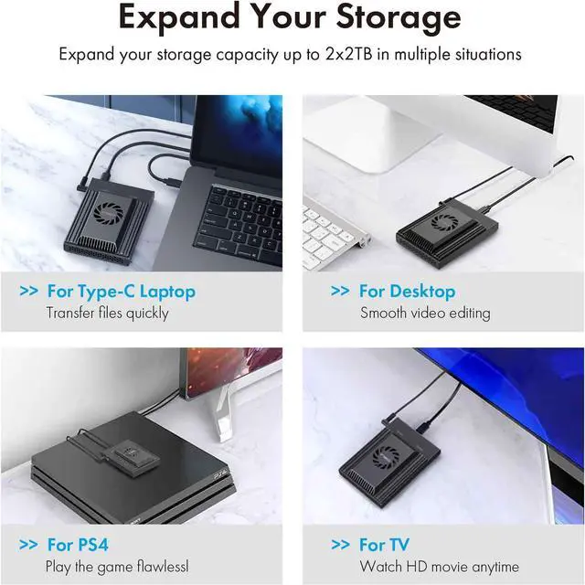 This M. 2 hard drive enclosure is specially designed for M Key NVMe PCIe SSD(22110/2280/ 2260/ 2242), supports 2 M. 2 NVMe SSD read and writes at the same time. Compatible with Windows/Mac/Linux, can be used to offline clone or to expand storage capacity by connecting PC, laptop computers, smart TVs, PS4, XBOX and other devices. falseThis NVME Docking Station only support NVMee interface. Support most PCIe NVMe M key or B+M key SSD. false- Full Aluminum construction for maximum heat dissipation. Built-in cooling fan will prevent your NVMe SSD from throttling due to high temperature.