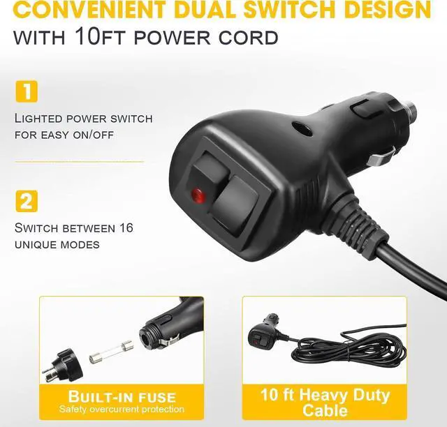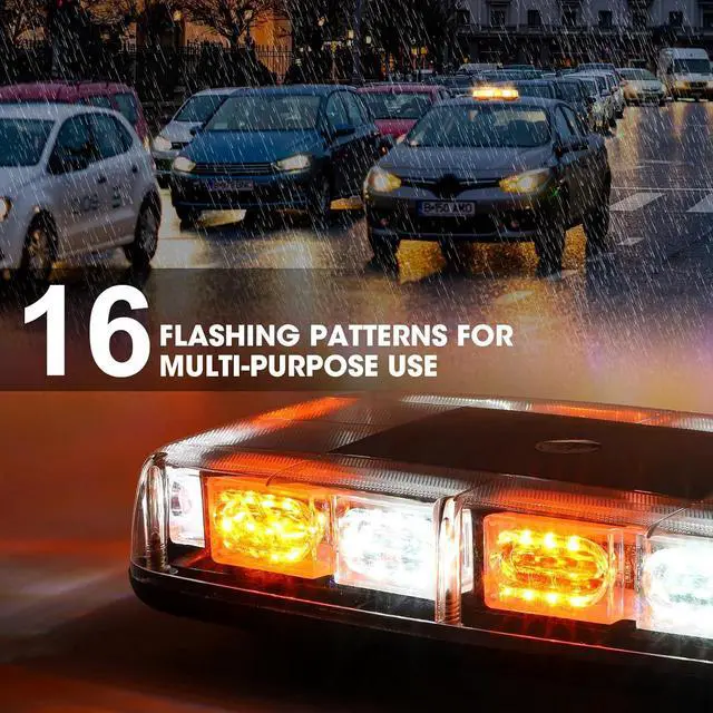 - 16 Strobe Flash Patterns: the caution flashing light adopts a convenient dual switch design; One is for easy power on or power off, another is for switching between 16 different flash modes, including rotating, flashing, alternating between left and right side and more