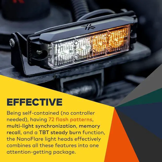 VERSATILE - Adaptable to any profession or situation, these lights are rated at the brightest of all classes (SAE class 1), available in various color options, and can easily be surface mounted or bracket mounted on your vehicle. falseBACKUP WHEN YOU NEED IT - Backed by an industry leading 3-year warranty and world-class customer service, you can confidently use the lights how you see fit and rest assure that we've got your back. false- EFFECTIVE - Being self-contained (no controller needed), having 72 flash patterns, multi-light synchronization, memory recall, and a TBT steady burn function, the NanoFlare light heads effectively combines all these features into one attention-getting package.