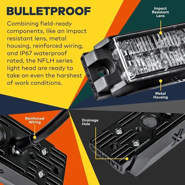 - BULLETPROOF - Combining field-ready components, like an impact resistant lens, metal housing, reinforced wiring, and IP67 waterproof rated, the NFLH series light heads are ready to take on even the harshest of work conditions.