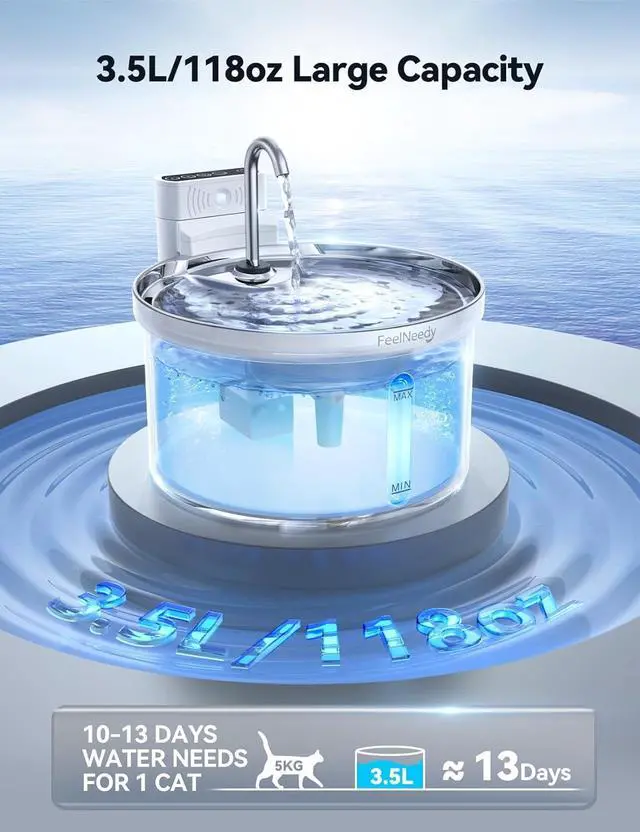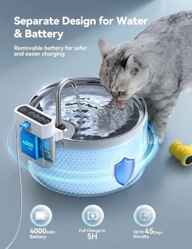 Battery Separation Design: Our upgraded wireless cat water fountain features separate water & battery components for enhanced safety compared to internal batteries, simply detach the battery and charge it independently. With a 200ml capacity water tray, it ensures ample hydration for your pets during outages. Fully charged 4000mAh battery can operate up to 45 days (in auto mode), 3.5L capacity meets an adult cat's water needs for 10-13 days, granting you peace of mind during traveling