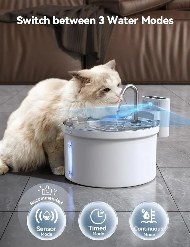 Water Flows: Our automatic cat water fountains offer 2 water flows (faucet and fountain) and 3 working modes to meet your pet's needs:
