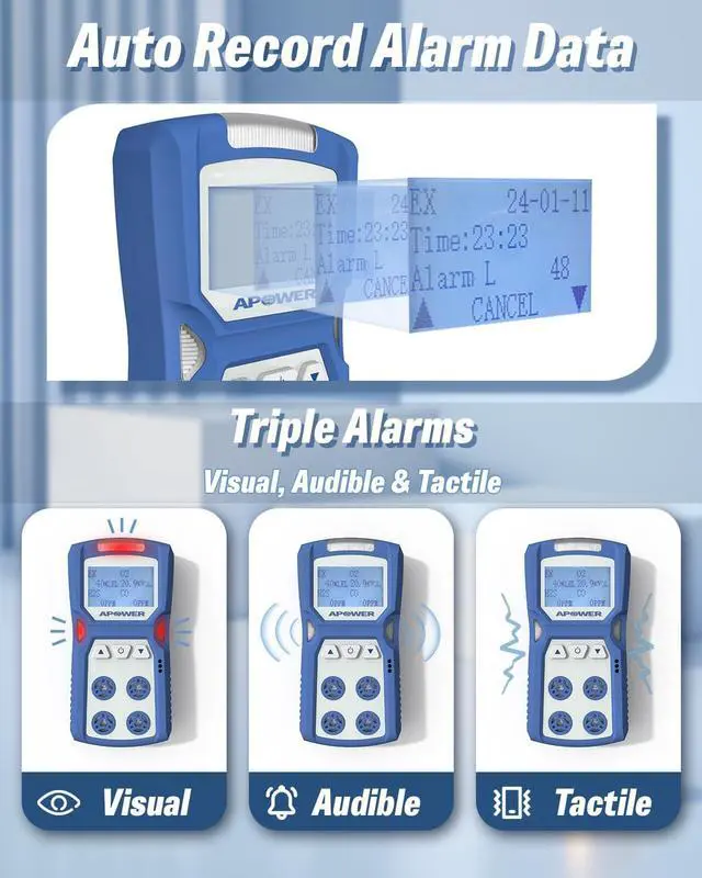 - Triple Alarms and Data Storage: The APOWER 4 gas leak detector utilizes three alarm modes: visual, audible, and vibration. It responds within 30 seconds and continues to alarm until the gas concentration returns to normal. Large-capacity alarm record storage function, which allows you to check monitoring data at any time