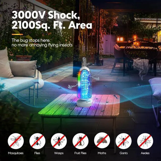 SMALL BUT EFFECTIVE, 3000V HIGH-VOLTAGE! - Featuring the enhanced 365-395nm bright blue-violet light lures mosquitoes and flying insects in, 3000V high-voltage electric grid will takes care of the rest. So you don't have to put up with the smell of sprays, insecticides and attractants, great for those who always have fruit and regular fly problems in the house during the summer and this is going to be a great way to deal with that(Tips: Works better at night and in dark environments)falseSMART AUTO MODE, POWERED BY A 4000MAH SUPER BATTERY - The smart day & night sensor supports to turn on at dusk and switch to sleep mode at dawn via pressing the auto mode button, saves your money, just set it and forget it! Also this rechargeable bug zapper comes with 4000mAh battery, provides up to 16 hours of continuous use on a single charge via Type-C USB (fully powered in just 3 hours). Easy to use and maintance, being able to clean the bugs out using water if don't want to mess with a brushfalsePORTABLE, LIGHTWEIGHT, IPX5 WATERPROOF - This fly zapper is wireless and compact enough to move between rooms, it comes with a rubber hook a hang just about anywhere - from ceiling to tent poles. The IPX5 waterproof design ensures it can withstand the elements, making it a reliable companion for any outdoor adventure. A very useful tool when go camping, both in dealing with bugs inside the tent and its usefulness as a lantern because of the other light functionsfalse