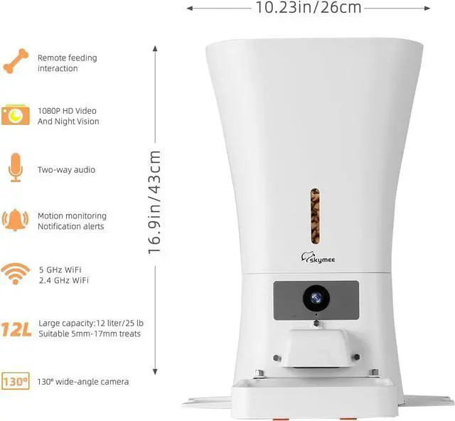SHARE -- Video and snapshot photo can be shared on Facebook with your family or friends. One skymee account can support up to 8 people online at the same timefalseMORE -- Skymee will alert you when it detects dog movements or food running low. Dual power supply system with external USB cable and 3 pieces D batteries (not included) to prevent power off. Support 2.4G & 5G WiFi. false- FEED -- 12L visualized large container with timed & customized feeding and remotely control feeding via app can schedule healthy feeding plans for your pet