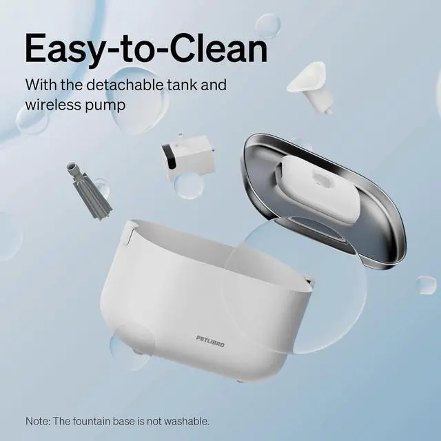 - Easy to Clean & Install: This pet water fountain features a detachable water tank design for easy refilling. The wireless water pump is easier to detach than a wired one, and there are no tangled cables to worry about when cleaning the pump and tank. (The cat fountains for drinking are wall-powered. Only the water pump of the cat fountain is wireless)