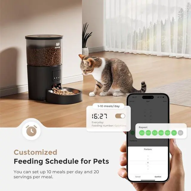- PRECISION DESIGN FOR OPTIMIZED EATING: Dual rotor structure prevents food from getting stuck, and the six-compartment rotor design ensures consistent pet food portions. The internal tilt angle allows for smooth and steady food delivery. The IMIPAW automatic cat feeders promotes healthy pet growth