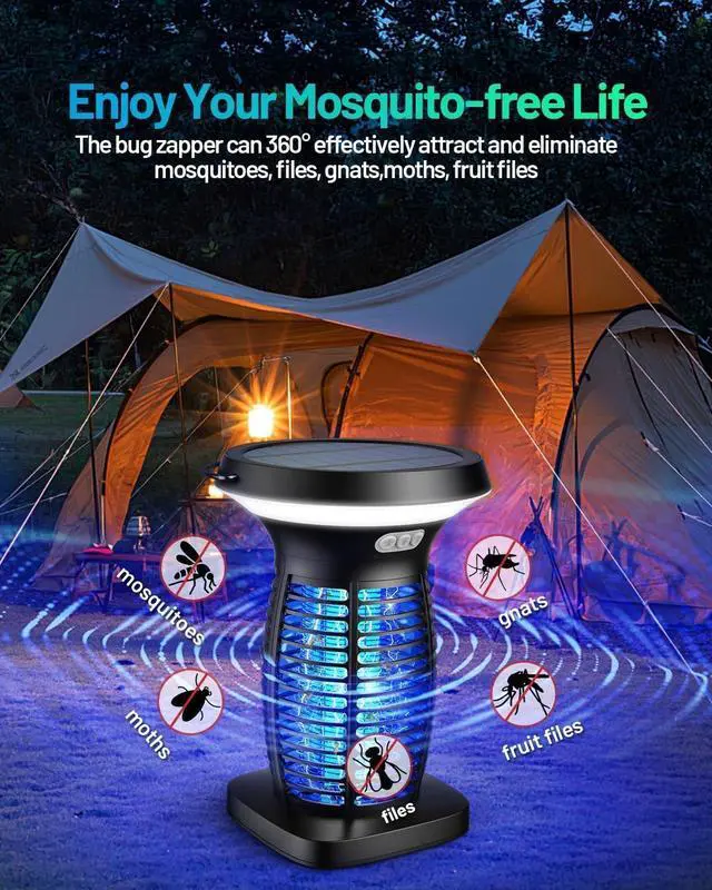 Mosquito-Free Life: The solar bug zapper outdoor uses a wavelength of 365-395nm to attract mosquitoes, flies, moths, and fruit flies both indoors and outdoors, then immediately eliminates them. The solar mosquito killer offers a safety and efficient physical solution for mosquito removal, providing a comfortable environment for you to enjoy quality time with family and friends.