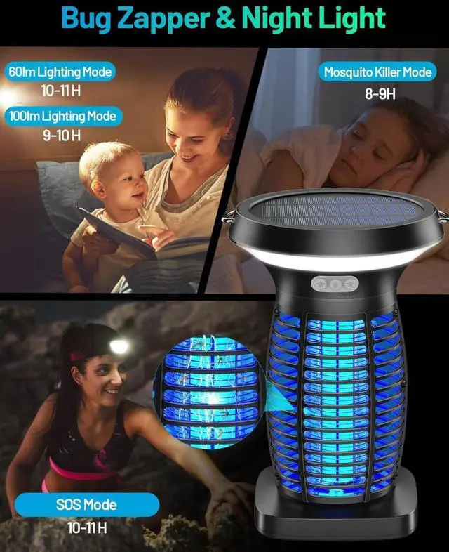 Camping Light: The solar power bug zapper offers three levels of brightness: medium, high, and SOS (flashing light). The LED lighting mode is perfect for camping, barbecuing, or picnicking with your family. It not only provides lighting but also eliminates annoying mosquitoes, allowing you to fully enjoy your tripLight-sensitive Mode for
