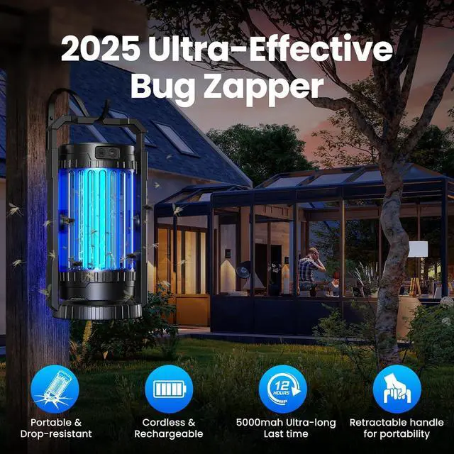 5X Stronger: 2025 Evolpol Upgraded rechargeable bug zapper outdoor uses 365-395nm ultraviolet light to safely and effectively kill mosquitoes, flies, wasps, moths, midges and other flying insects. 5X Stronger attract mosquitoes and equipped with 4200V high-voltage power grid, it can effectively electrocute and kill flying insects