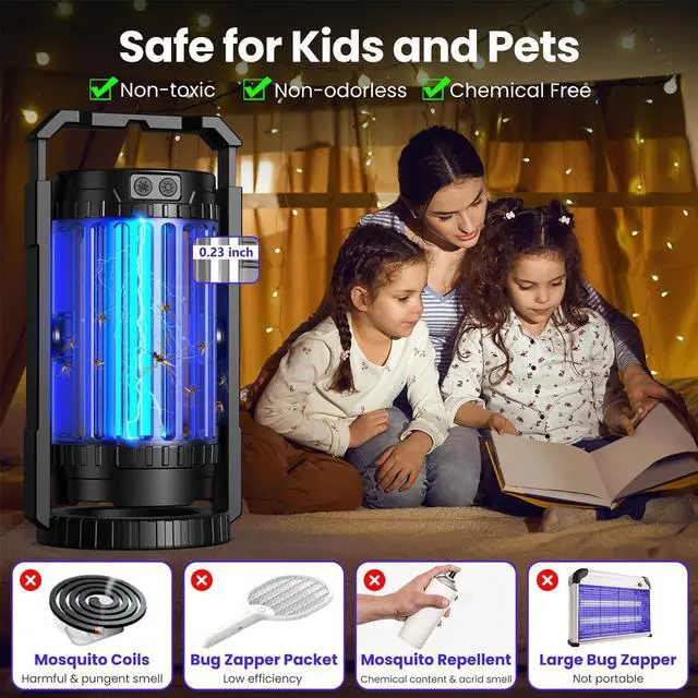 Wider Coverage: The Outdoor Bug Zapper has a coverage area of up to 2100 square feet. For example, camping, terrace, swimming pool, backyard, garden, garage, kitchen, bedroom and other indoor and outdoor places, which canquickly capture and electrocute flying insects to achieve rapid and thorough elimination. 100% Physical mosquito control, friendly and safe for the elderly, children and pets