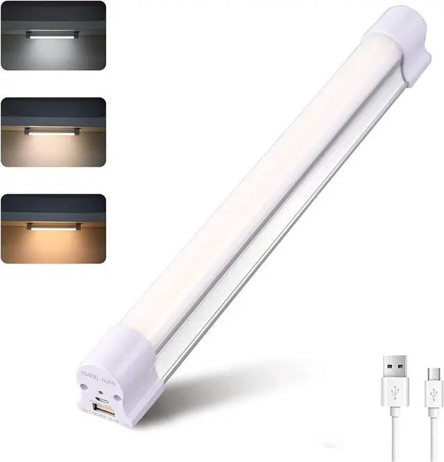 - Stepless Brightness Adjustable- with 3 Lighting ColorWhite light 6000K / Warm-white light 4800K/ Yellow light 3000KA new upgraded dimming method with stepless adjustment. Provide you with more variety of brightness solutions, press and hold the switch, release the button to stay the under cabinet lighting at your desired brightness, multi-function wireless LED fluorescent meet your different need. Premium LED tube light with 10400 mAh capacity battery, support for 80H working time.