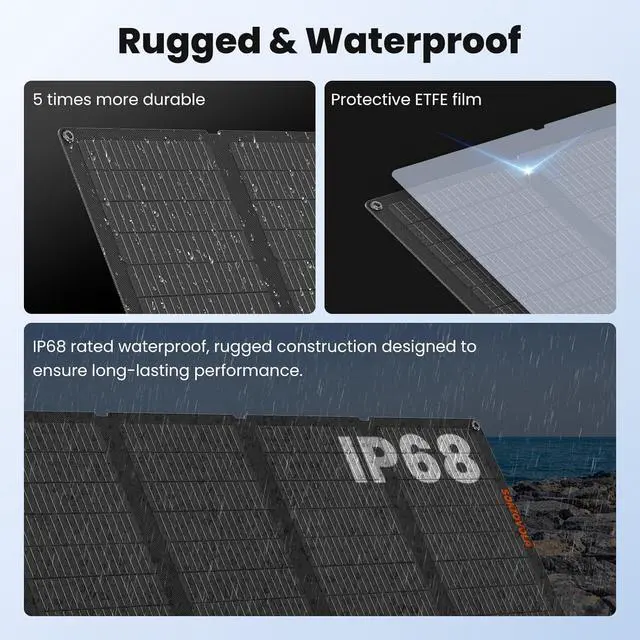 - Waterproof and DurableSOKIOVOLA Portable Solar Panels are made of advanced ETFE lamination process, SOKIOVOLA outdoor solar panels are made of Waterproof Dragon Dance Cloth, which can withstand any outdoor conditions.
