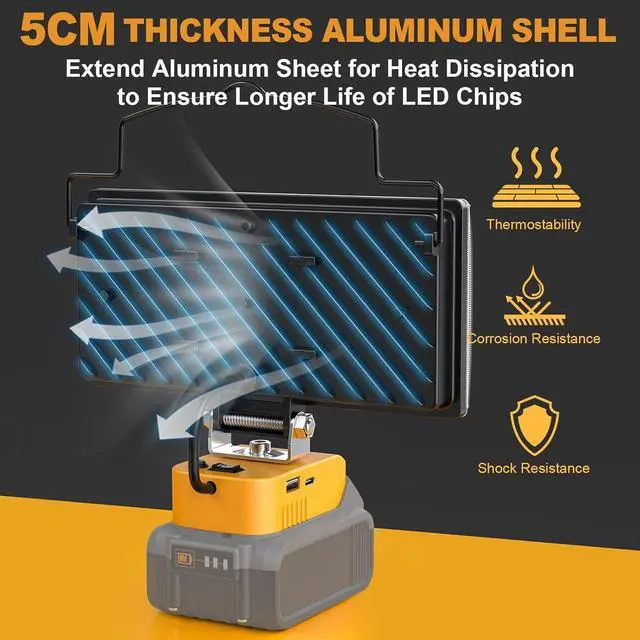 - ROTATABLE & CHARGING - The cordless outdoor lights has 140° rotatable design. It can adapt to different work scenarios and lighting needs in different directions. It also has a USB-A & USB-C charging port, which can be used as a power bank to charge your mobile phone, headsets, tablets, speakers or other devices while working. It's a great led work light option for dewalt 20v battery tool bag or box