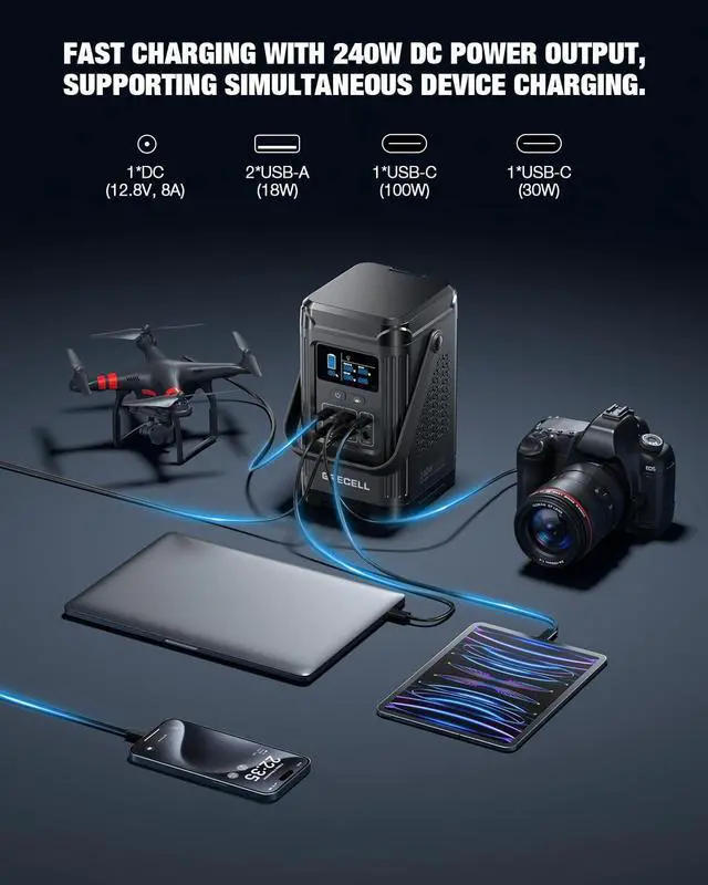 - WHAT YOU GET -1* GRECELL 240W Power Station, 1 * USB-C Charging Cable, 1 * DC to Cigarette Lighter Outlet (Output), 1 *
