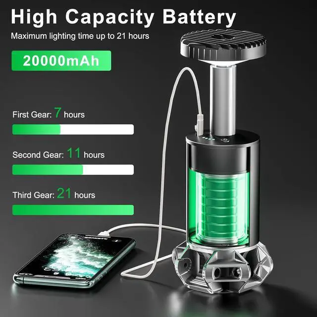 High-Capacity Waterproof Camping Lantern: Equipped with a 20000mAh rechargeable battery, this emergency lantern provides up to 21 hours of continuous light. Functioning as both a camping light and rechargeable work light, it doubles as a portable power bank for charging phones/tablets. Its waterproof design and built-in outdoor storage ensure reliability in rugged conditions. Ideal for camping, hiking, or emergencies.