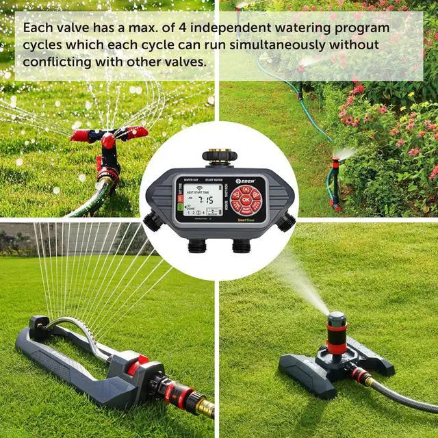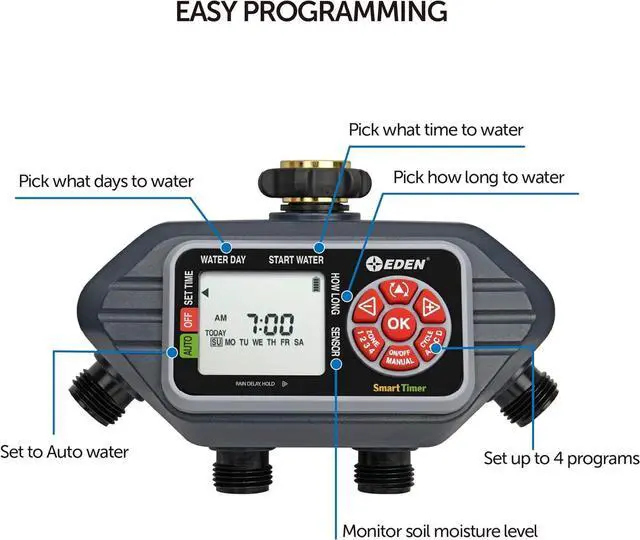 Manual watering option lets you water on demand from 1 minute to 6 hours. falseRain delay feature pauses your watering schedule if rain is in the forecastfalseThe Eden 4-Zone Digital Programmable Water Timer can be easily programmed to water at different times during the day. Each valve operates as a separate water timer to water four separate areas from one faucet. Simply choose what days you want to water, the time of day to water, and how long to water for a customized watering schedule. Hit the manual watering button to water on demand for 1 minute to 6 hours or use the rain delay feature to pause the watering schedule when rain is in the forecast.