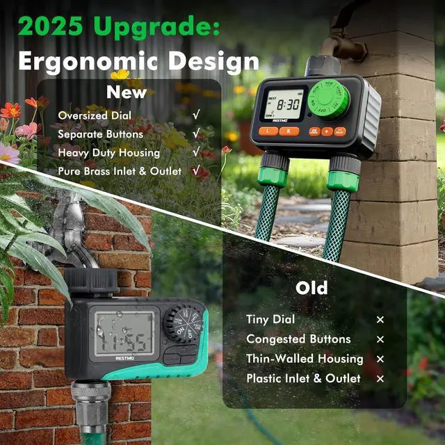 - Built for Outdoor UseDesigned with IP55 waterproof protection and leakproof construction, this timer is perfect for various outdoor watering applications, including garden hose irrigation, lawn sprinklers, greenhouse misting, pool filling, birdbaths, rain barrels, and even pet water dispen