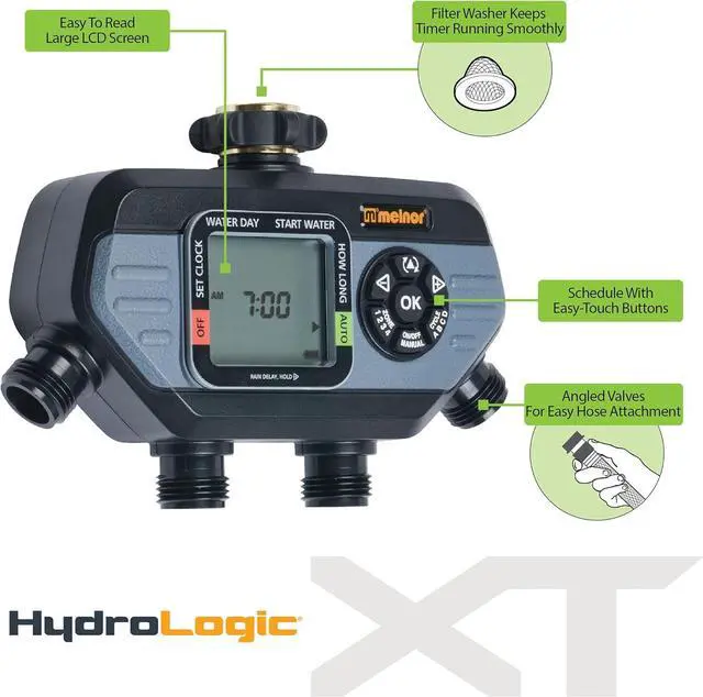 Requires 2 x AA batteries (not included) falseBacked by a Melnor 7-Year Limited Warranty. Melnor stands behind its products. falseKeep up to four areas of the yard regularly watered with the HydroLogic® 4-Zone Digital Water Timer. Easily select up to four separate start times on each valve to water exactly when you want. Each zone works like a separate timer, so the squash and sunflowers can be watered every morning while the lawn sprinkler comes on every few days. Avoid wasting water when it rains with the handy rain delay to pause the watering schedule for up to 7 days, the schedule will resume when the delay is over.