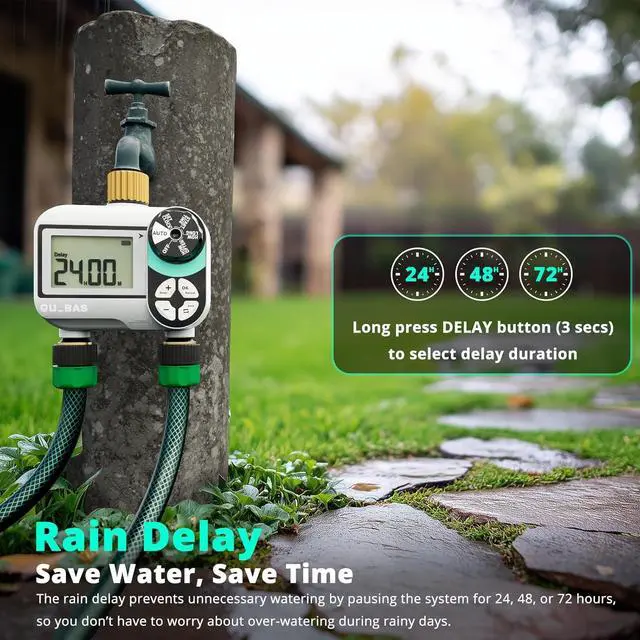 Delay WateringPostpone watering for 24, 48, or 72 hours, ensuring smarter water usage during rainy days. falseLeak-Proof DesignThe brass inlet and outlet are compatible with standard 3/4" NH faucets in the U. S. This digital water timer can handle the flow rate max to 10 gallons per minute, and can withstand the water pressure from 8 psi to 120psi. false- Dual-Zone ControlThe Quobas WT12 sprinkler manages two independent watering zones (Zone 1 and Zone 2) with separate schedules, ensuring efficient and customized irrigation for different areas of your garden.