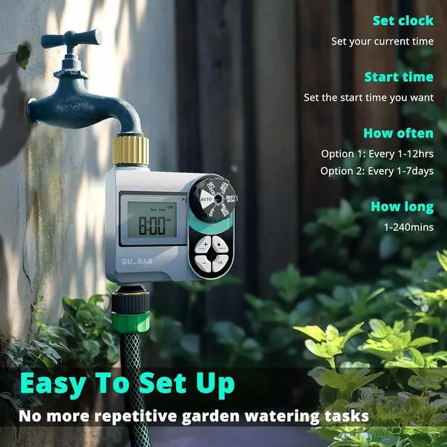 Use Manual Mode for on-demand watering, or activate Rain Delay to pause watering for 24, 48, or 72 hours when the soil is already moist- [EASY-TO-USE & PROGRAMMABLE] Take control of your garden's watering schedule with ease. Simply set the "Set CLOCK, " "START TIME, " "HOW LONG" and HOW OFTEN to automate your sprinklers. Choose watering durations from 1 minute to 240 minutes and frequencies from every 1-12 hours or 1-7 days for a fully customized irrigation plan.