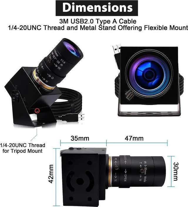 Applications: Solid aluminum case with dual installations: 1/4 inch screw hole at bottom for tripod mount/webcam holders, and extra metal stand for wall mount for multi-angles placement needs for pc computer, laptop, desktop, desk and even other flat surfaces. Great for industrial embedded project, online class, live streaming. Wide compatible with Windows, Linux, Mac and Android systems. Support OTG protocolfalse-
