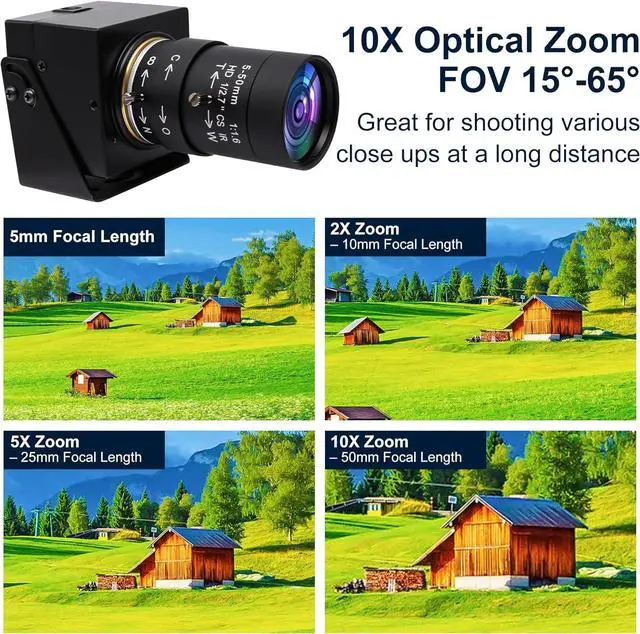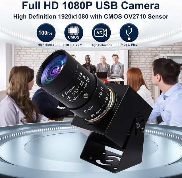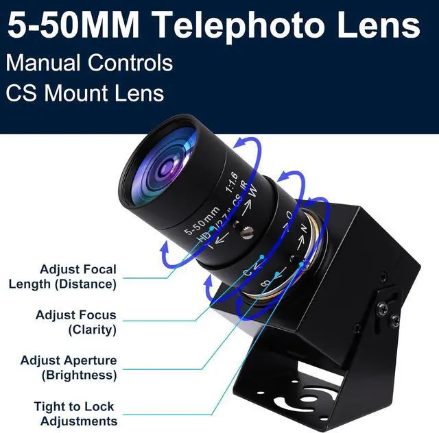 - CS Mount 5-50mm Varifocal Lens: 1080P webcam with standard CS mount lens that can be changed. Manually adjustable focus, focal length and aperture for more applications, perfect for close-ups shooting