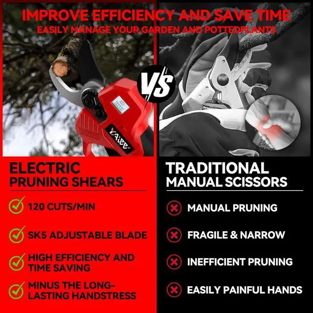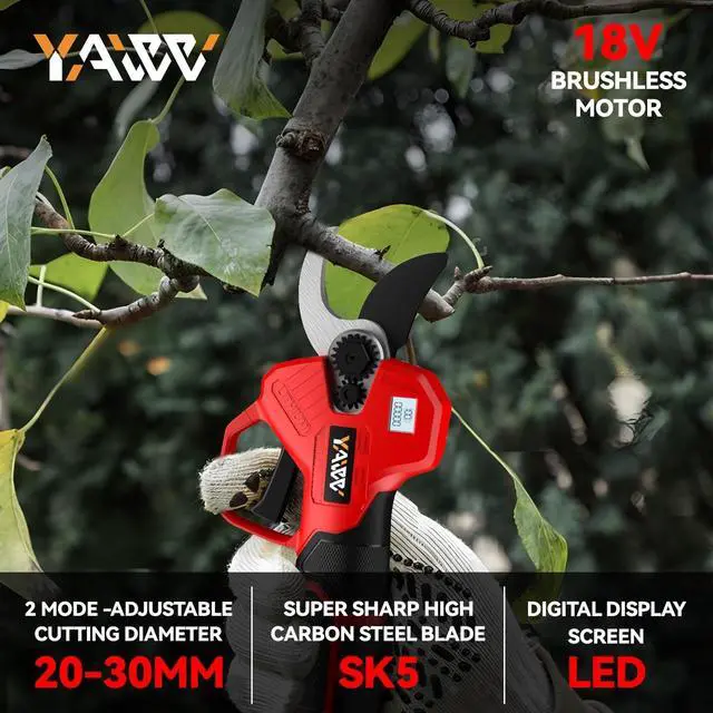 - 0.5 s Efficient Fast trimming - YAWV Professional electric cordless pruning shears is forged from SK5 high carbon steel which is sharp and anti-rustand, Just insert the battery to turn on and flip the trigger to get fast trimming at a rate of 0.5 seconds. Complete your pruning tasks easily and efficiently