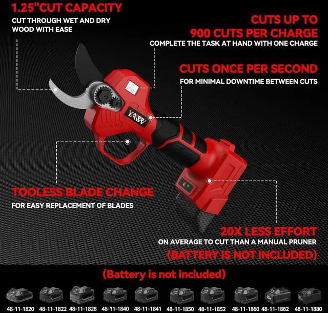 - Compatible With Milwaukee Batteries - The YAWV Hand-held branch trimmer compatible with Milwaukee M18 battery, suitable for 48-11-1820 48-11-1822 48-11-1840 48-11-1841 48-11-1828 48-11-1850 48-11-1852 48-11-1860 48-11-1862 48-11-1880 and more. We focus on reliable tools, provide Milwaukee power access solutions, stay away from inferior and dangerous batteries, and if you already own Milwaukee batteries and chargers, you will avoid unnecessary expenses