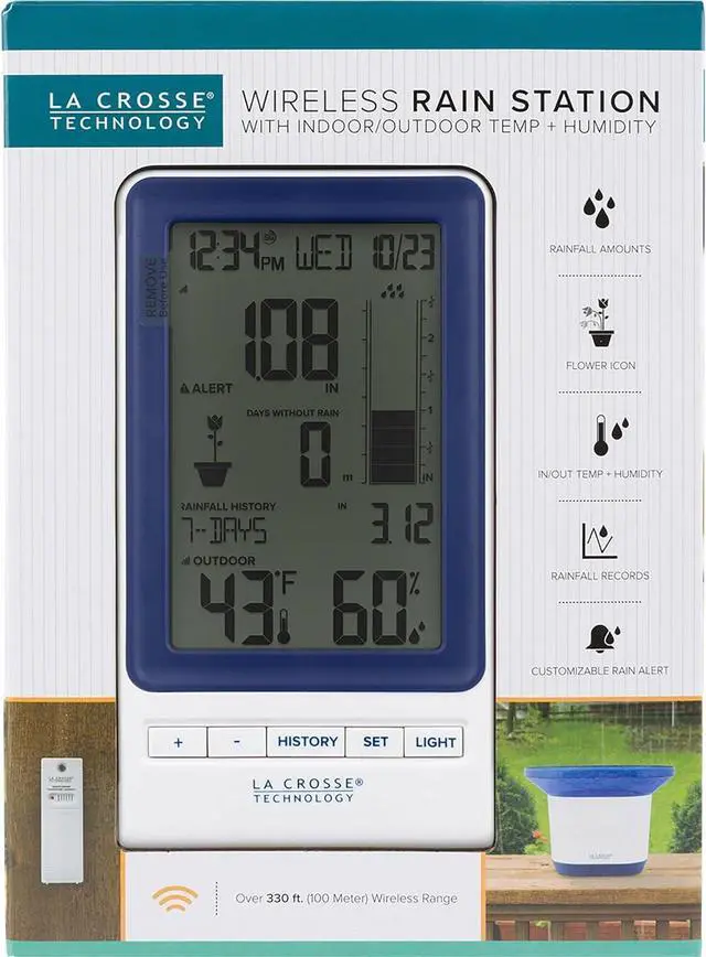 Calendar: Day/Month/DatefalseKnow how much rain you got overnight on the new digital wireless rain station. Numeric measurements are monitored on the digital indoor base including historical data and a cylinder rain graph. Wide-mouth rain bucket self-empties from collection rocker and transmits over 330 feet. Adjustable settings with customizable rain alert, and optional backlight feature, allows you to personalize the display to your liking. Requires 6 AA batteries (not included) for complete operation.