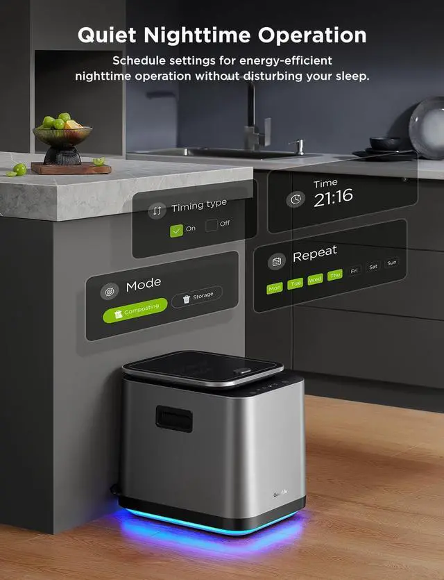 App: You could create a composter schedule and monitor the status via the app from everywhere, Goveelife Smart Kitchen Composter saves your time and consumes less energy too. Compatible with Alexa, Google Assistant, and Siri.