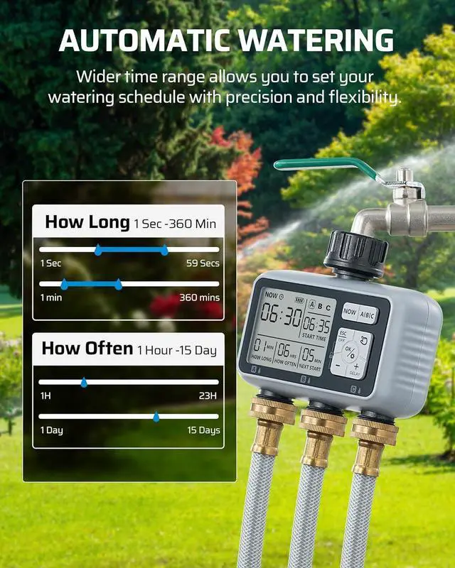 [Dependable & Watertight] Crafted from durable brass at the inlet and included adhesive tape (you can wrap around the faucet) ensure a snug connection with the sprinkler timer; this setup preserves water pressure unaffectedly, enduring pressures of up to 120 psi; sun-resistant ABS plastic shell and IP54 waterproof rating are ideal for outdoor applicationsfalse[Multi-Mode & Child Lock] The manual mode is intended for short-term emergencies without altering the preset automatic programs; rain delay mode prevents excessive watering of plants/flowers during rainy spells, conserving water; the child lock feature guarantees that children and pets cannot disrupt the water timer's operationfalse[Battery Recommendation & Warranty] Operated by 2 1.5V AA batteries (batteries not included), the valve will automatically close when the battery charge is low; 1-Year Warranty provided, DEWENWILS professional customer service team offers 24/7 delicate support, we are always standing by youfalse- [3 Independent Zones] Our faucet timer offers individual control over 3 zones (A, B, C), enabling tailored adjustments for start times, watering durations (1 second to 360 minutes), and watering frequencies (every 1 hour to 15 days); ensures optimal watering schedules for gardens, yards and lawns