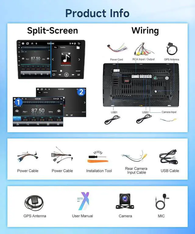 Screen size: 10'', equipped with 1GB RAM + 32GB ROM, Support GPS/WiFi, 2 Spilt Screen. Have professional technical team and great customer service, we offer 30-day Money-Back, 12-month Replacement, life-time Technical Support.