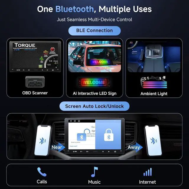 - BLE Connectivity & Control: Pair with OBD II scanners or ambient lights, then m0nitor and manage everything on the double din stereo car screen. Screen Lock with Bluetooth Unlock safeguards your data, auto-locking when you step away and unlocking upon reconnection