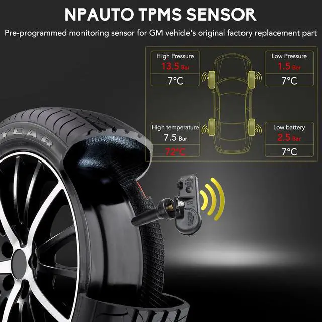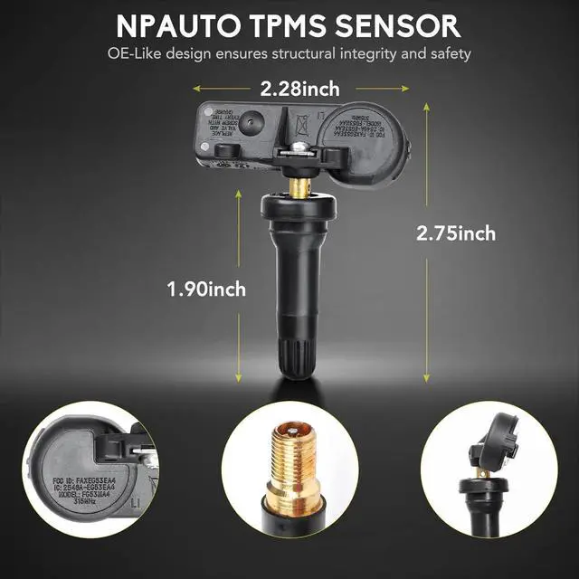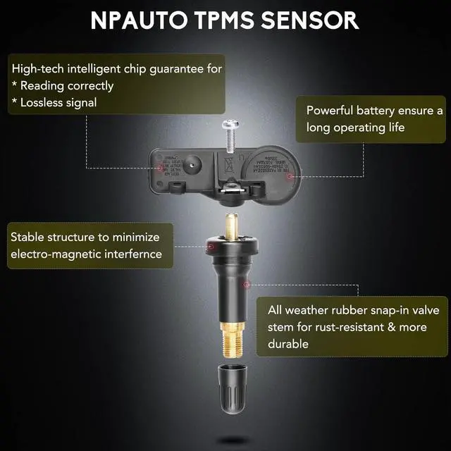 - [High Quality & Reliable Design]: This tire pressure monitoring system is made of premium engineering materials, is more resistant to cold and heat. All weather rubber stem is designed to prevent rust and more sturdier. It also comes with high-tech intelligent chip, to support reading correctly and work perfectly, fix your tire pressure monitoring light problem. OE-Like design ensures Structural Reliability, Durability and Safety of TPMS