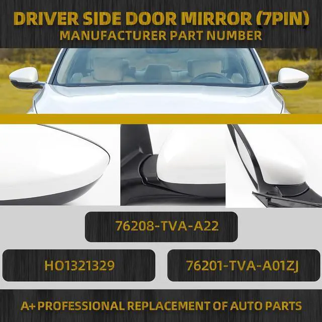 Feature Our honda accord mirror is Reliable and Stable, with Good Hardness and Toughness to Improve Long Life, Corrosion Protection, the sport driver side mirror totally Meeting OEM Requirements. falseEasy installationEasy to intall, the honda accord side mirror only takes you few minutes to finish installation with suitable design. false- ReplaceThe Honda Accord Passenger Side Mirror replaces# 76208-TVA-A22, HO1321329, 76201-TVA-A01ZJ