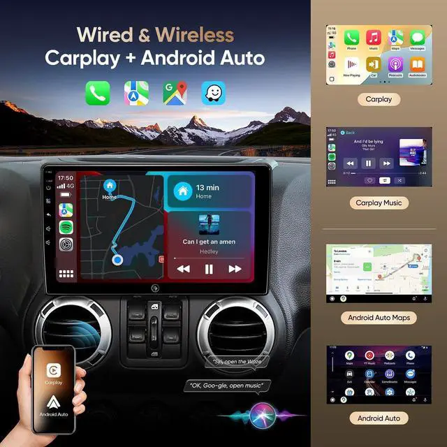 Wired/Wireless CarPlay & Android Auto: This jeep jk radio is equipped with the latest technology of wired/wireles CarPlay and Android Auto, allowing you to seamlessly integrate your smartphone apps into your car's infotainment system. You can easily wake up Siri or Assistant to operate apps and perform various tasks, such as making calls, sending messages, finding directions, and controlling music playback. Enjoy a hands-free and safer driving experience. Advanced GPS Navigation& WiFi ConnectionThe jeep wrangler stereo comes with North American maps, allowing you to plan your routes efficiently. With the included GPS antenna, you can easily connect and navigate through various destinations. Experience seamless connectivity with the built-in WiFi hotspot feature. Connect effortlessly to browse and download online navigation apps, social media platforms from the Play Store. Bluetooth Call, Built in-DSP & FM RadioBluetooth 5.0 offers faster transfer speeds. Quickly pair it with your smartphone, play music and download the contacts book. Equipped with built-in mic and external mic to ensure clear and stable audio quality for hands-free calls. Built in-DSP, you can accurately adjust to any music sound pattern you like, more immersive sound.