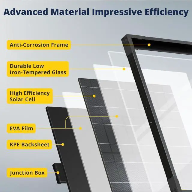 - Superior Quality and EfficiencyThis 12V monocrystalline solar panel has an effective conversion rate of up to 24%. Made with premium Grade A+ solar cells, it features tempered glass and a durable, corrosion-resistant aluminum frame. Designed to withstand extreme weather, including UV, rust, erosion, hail, and sandstorms, it can handle up to 2400Pa wind pressure and 5400Pa snow load.