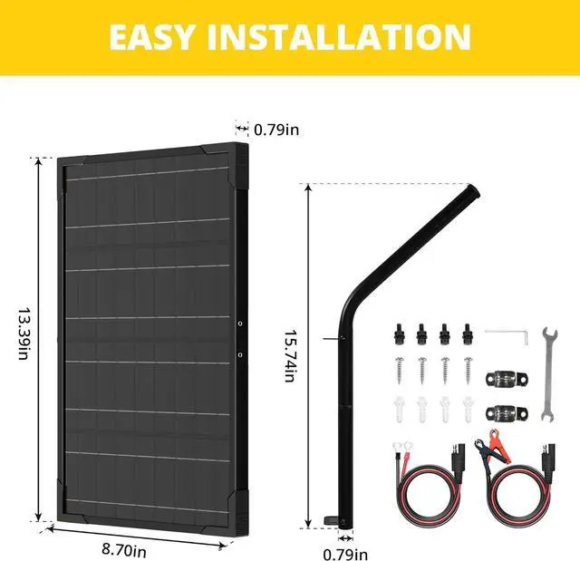 - Package includes 1*10W Solar Panel, 1*Mounting Bracket, 2*SAE connection cable(1*Alligator Clip, 1*O-ring), 2*Arc mounting ring2*Wrench1*Set of screws and screw sleeves4*Plastic expansion Tube, 4*Expansion scre