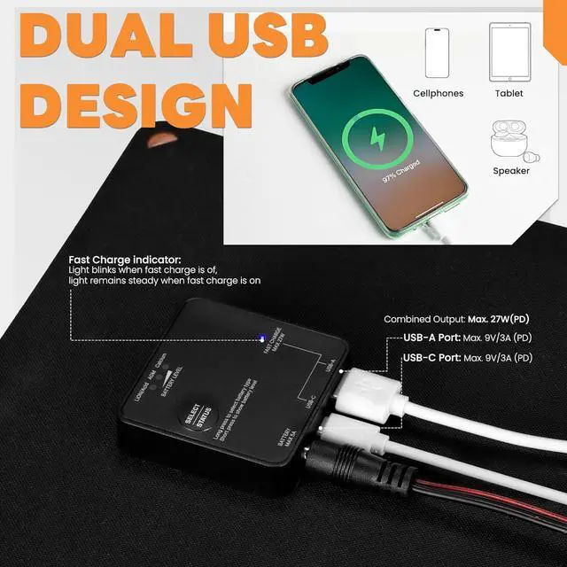 Charge Indicator: Light blinks when fast charge is off; light remains steady when fast charge is on. Fast charging is not limited by battery typ. FieryRed 30W solar panel is also equipped with a built-in controller to prevent overcharging.