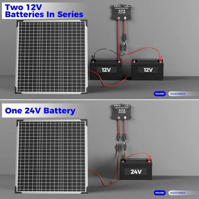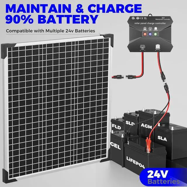 - Versatile ChargingThis 24V solar battery charger is designed to charge and maintain a wide range of 24V batteries, including: Lead-Acid BatteriesLithium-Ion (Li-ion) BatteriesNickel-Cadmium (NiCd) Batteries and Nickel-Metal Hydride (NiMH) Batteriessuch as GEL, FLD, SLD, AGM, SLA, LiFEPO4, deep cycle, sealed lead-acid, etc.
